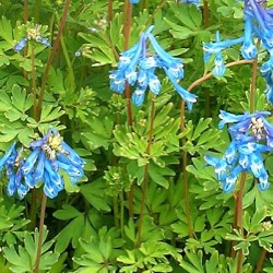 Fijn geveerd blad, dieprode stengels met trosjes Meconopsis-blauwe bloemen.